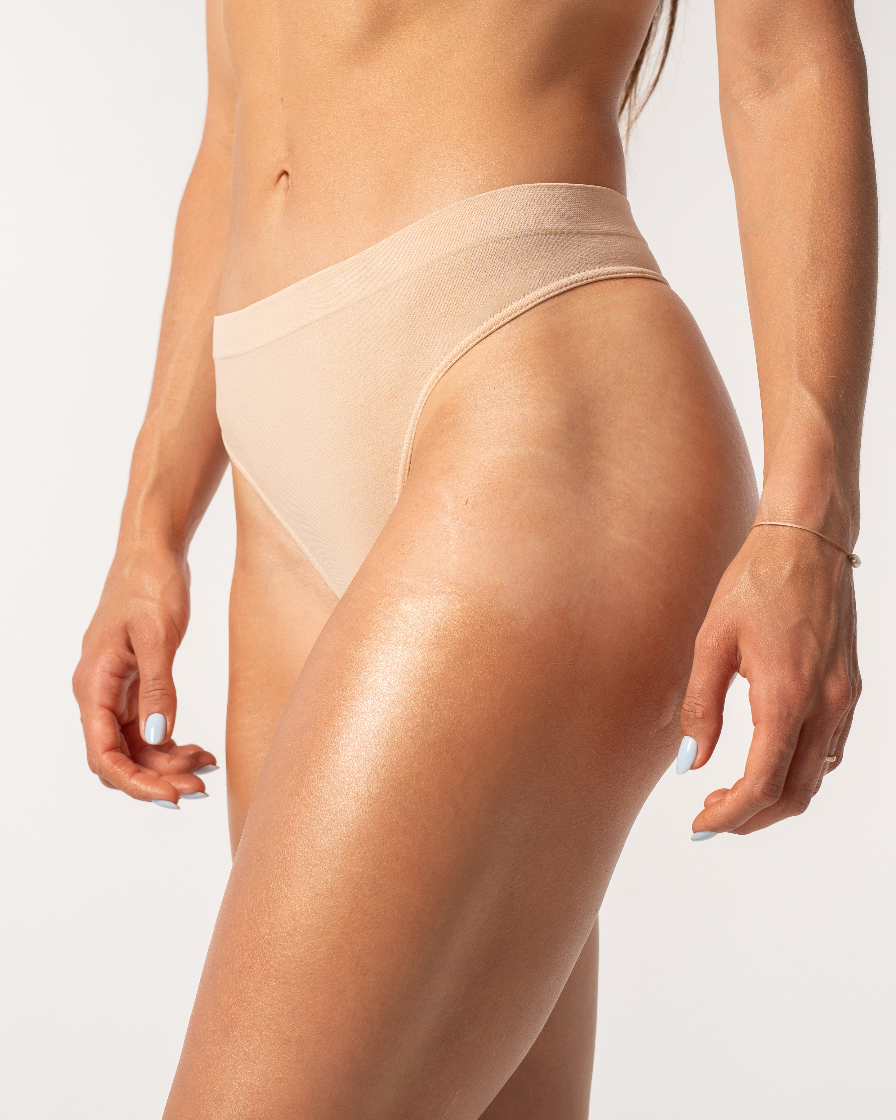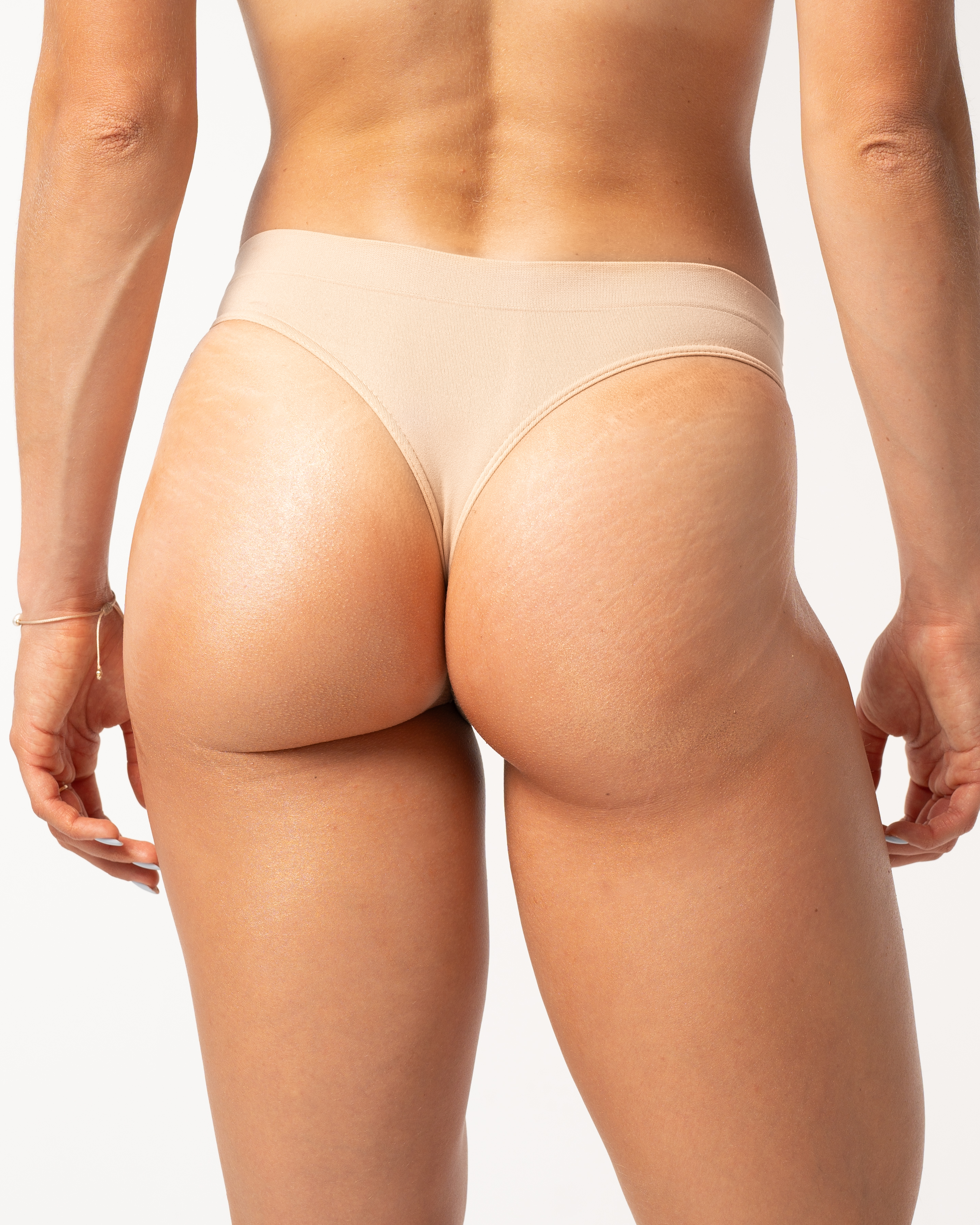 Majtki bezszwowe stringi w kolorze beżowym. Pozwalają na prawidłowe ułożenie się legginsów lub kolarek na pośladkach.